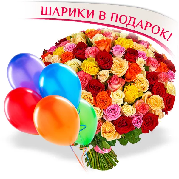 101 роза: роза красная - 101 шт. (высота розы - 50 см), 5 разноцветных шара (красный, желтый, синий, зеленый, фиолетовый).